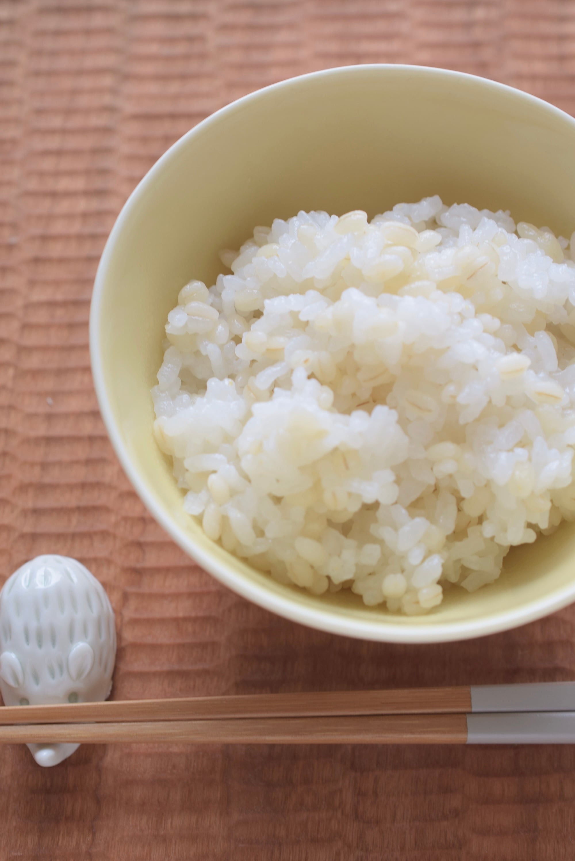 米2合にもち麦100g(約1/2カップ)をまぜ水を3合分入れて炊いてください。